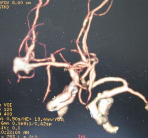 病例1、手术夹闭动脉瘤:男性,62岁,右侧大脑中动脉动脉瘤破裂出血,并形成脑内血肿。经过全科医生分析,动脉瘤位置浅,宽颈,而且形成了脑内血肿,栓塞相对较困难,决定施行动脉瘤手术夹闭+血肿清除术。3月14日,孟祥靖主任带领崔友强副主任医师、张霄川医师在手术室、麻醉科的配合下,顺利夹闭动脉瘤,经CTA复查,动脉瘤完全消失,大脑中动脉通畅,目前,患者已痊愈出院。