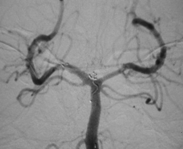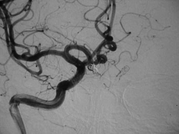 病例4、手术和栓塞均可以的动脉瘤:女性,58岁。右侧前交通动脉瘤破裂出血,动脉瘤大小3X3X2mm,患者已经是第二次出血,为防止动脉瘤再次破裂危及生命,需尽快处理动脉瘤。根据患者情况,手术夹闭和介入栓塞均可以,孟祥靖主任仔细向患者家属交代病情,并详细介绍了两种治疗方法的优缺点,家属经过慎重考虑,决定施行动脉瘤介入栓塞术。3月31日,孟祥靖主任带领郭建主治医师在介入科、麻醉科的密切配合下,顺利闭塞动脉瘤。患者恢复良好,已痊愈出院。