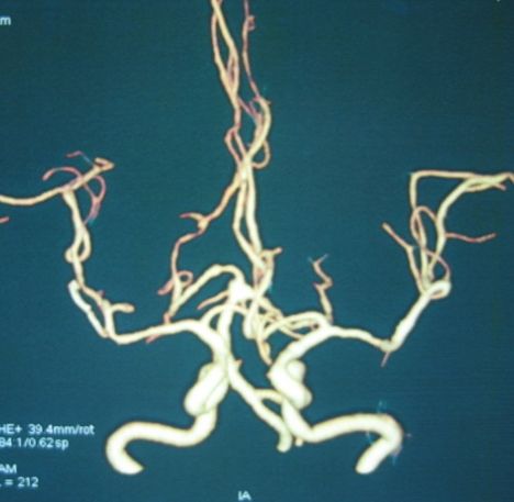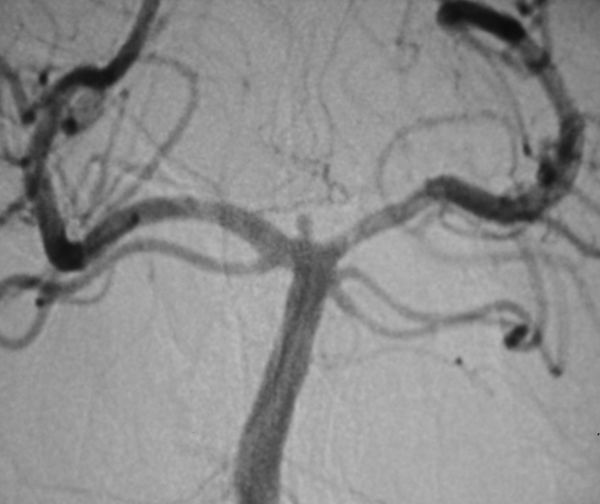 病例2、微小动脉瘤栓塞:女性,52岁,基底动脉顶端微小动脉瘤破裂出血,动脉瘤大小约1.5X1mm,位置深,周围重要结构多,手术夹闭困难,经全科医生认真分析,决定采取支架辅助+弹簧圈栓塞的方法,介入栓塞治疗,3月18日,孟祥靖主任在介入科、麻醉科的大力配合下,栓塞取得圆满成功,目前患者已痊愈出院。