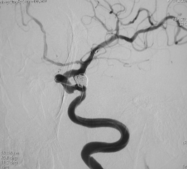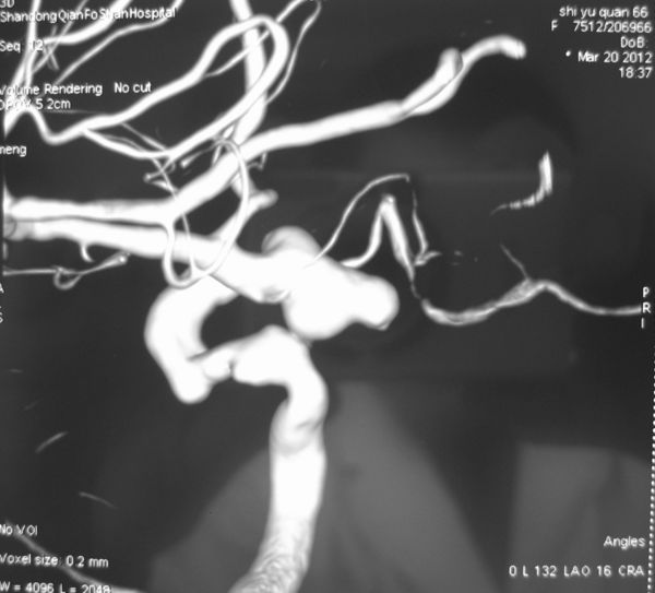 病例3、巨大动脉瘤栓塞:女性,66岁。左侧后交通巨大宽颈动脉瘤破裂出血,动脉瘤大小约7X8X10mm,患者意识模糊,脑肿胀明显,脑压极高,手术夹闭困难,为了防止动脉瘤再次破裂出血危及生命,孟祥靖主任带领全科医生经过仔细分析,决定采用支架辅助+弹簧圈栓塞的方法处理动脉瘤,3月20日孟祥靖主任、郭建主治医师在介入科、麻醉科的密切配合下,动脉瘤完全闭塞,目前,患者一般情况好,正在逐步康复中。