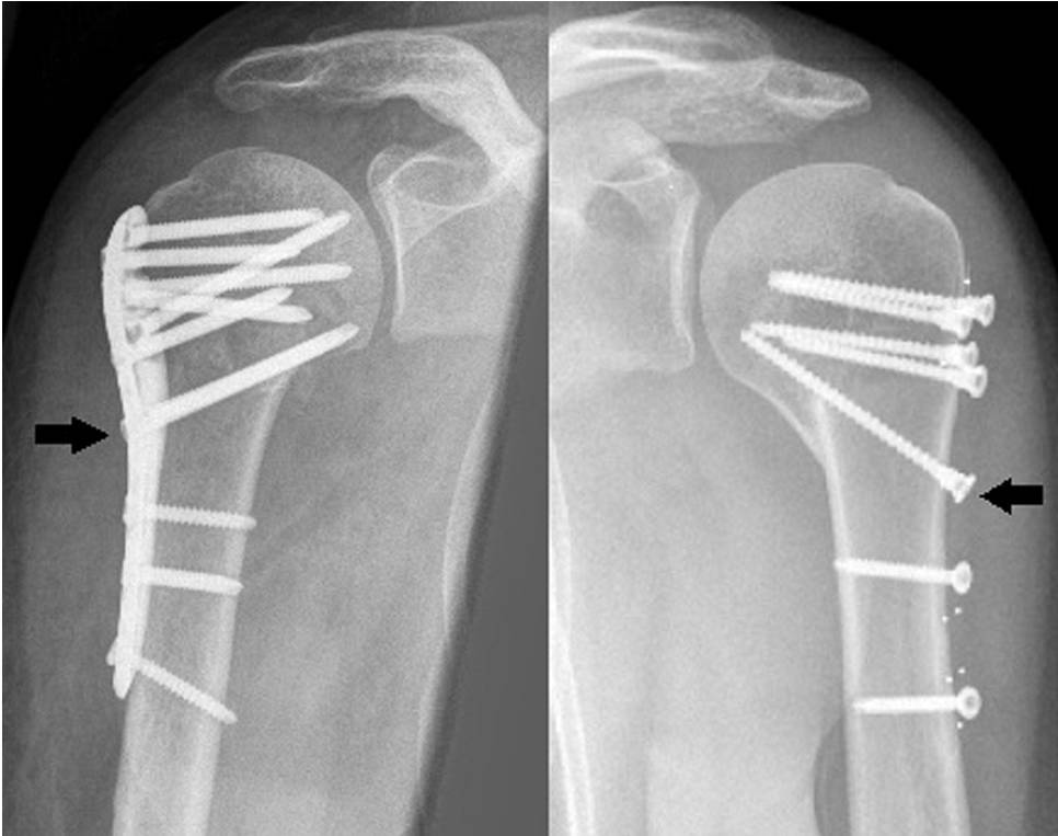 肱骨近端骨折锁定钢板固定时,内侧支撑螺钉(黑色箭头)维持肱骨内侧柱稳定性。