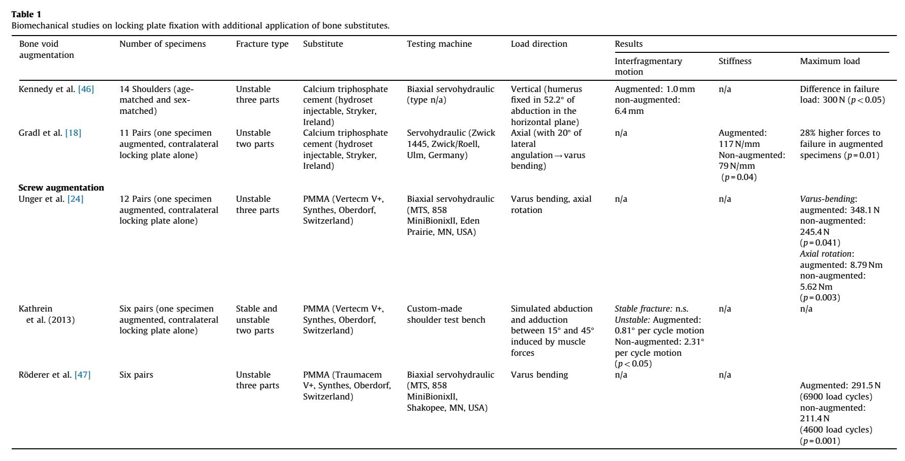Mathison教授等首先对锁定钢板联合髓内植骨与单独使用锁定钢板的生物力学改变进行研究,用6具尸体标本进行这两种固定方式的比较,平均骨龄85.8岁。肱骨外科颈10mm楔形截骨模拟来内侧柱的粉碎性骨折.结果显示通过髓内带血管腓骨移植可将内固定失效负荷提高1.72倍(标准差0.54;p