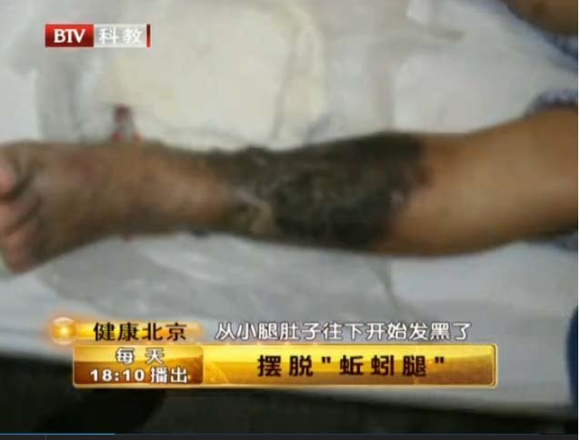 4、晚期,小腿和踝部皮肤常有褐色色素沉着和湿疹,轻微损伤常可导致经久不愈的慢性溃疡。