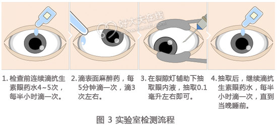 实验室检测主要是通过抽取眼内液进行检测,流程很简单(如图3)。在做眼内液穿刺前,大夫会先给患者用一些抗生素类眼药水,每半小时滴一次,4~5次之后进行表面麻醉。麻醉也是通过滴眼药水的方式进行的,每五分钟一次,一般滴三次就够了。医生在显微镜下进行眼球穿刺抽取眼内液,大约0.1毫升即可。抽取后嘱咐患者还要用抗生素眼药水频繁滴眼,每半小时滴一次,一般持续到当天晚上就可以停药了。我本人迄今为止进行了3000多次眼内液穿刺,没有出现任何并发症。