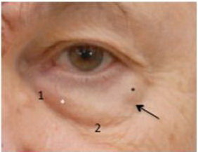 如图所示:1、代表泪沟。2、准确的叫睑颊沟,手术中可以和泪沟一起填充。黑点和白点代表不同部位突出的脂肪团,即眼袋。