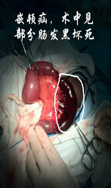 2.最严重的临床表现是嵌顿疝并肠绞窄:患者呈持续性剧烈腹痛,呕吐频繁,呕吐物含咖啡样血液或出现血便;腹部体征呈不对称腹胀,有腹膜刺激征,肠鸣音减弱或消失;腹腔穿刺或灌洗为血性积液;X线检查见孤立胀大的肠拌或瘤状阴影;体温、脉率、白细胞计数渐上升,甚至出现休克体征,危及生命。预防和治疗的方式是手术。一例嵌顿疝引起的肠坏死。